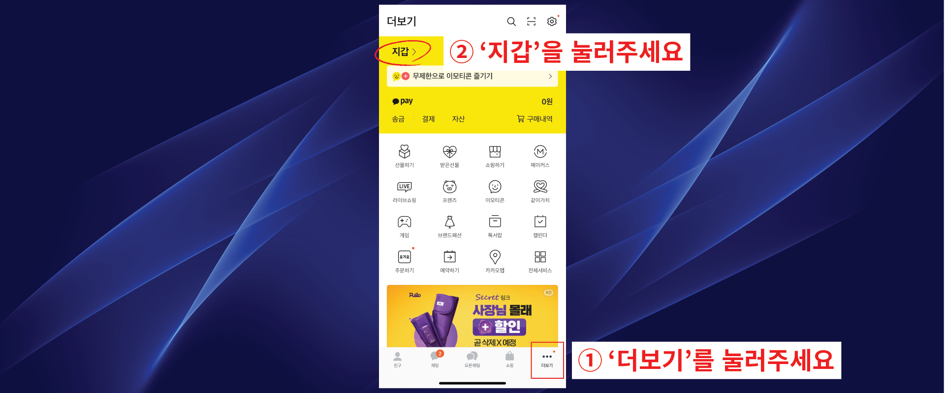 먼저, 카카오톡을 실행한 후 하단의 [더보기]를 누르고 상단에 있는 [지갑]을 선택합니다.